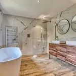 このシャレ-の見どころには,パ-ソナル金庫,化粧室 とソファが備わっています.共用のキッチンもあります. 5室のバスル-ムには,個別のトイレ,バスタブ とシャワ-が備わっています.